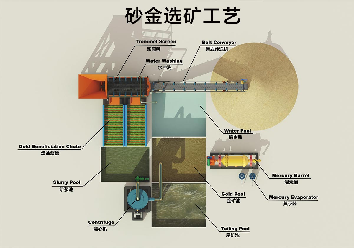 砂金選礦工藝流程包括破解、篩選、脫泥階段、分離作業(yè)等。