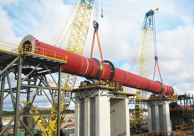 鎳紅土回轉(zhuǎn)窯工作過程中,天然鎳紅土礦物從窯筒高處給料管喂入窯筒內(nèi),由于窯筒的傾斜和緩慢旋轉(zhuǎn),使鎳紅土礦物產(chǎn)生沿圓周翻滾并沿軸向從高溫端向低端移動(dòng)的復(fù)合運(yùn)動(dòng),生紅土鎳礦從窯底排出,進(jìn)入冷卻器。